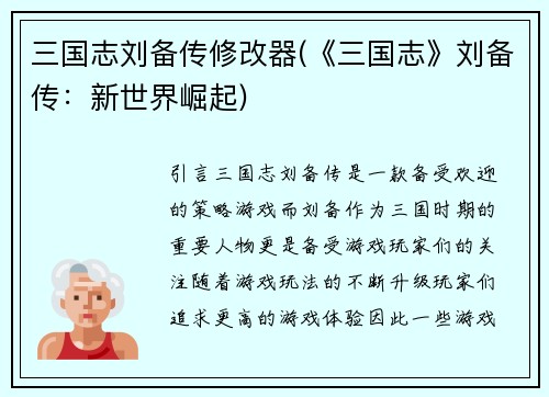 三国志刘备传修改器(《三国志》刘备传:新世界崛起)